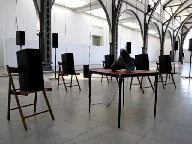 The Janet Cardiff/George Bures Miller installation The Murder of Crows, recently on view at the Park Avenue Armory, prompted in us a remembrance of that revealing bit of literature. Entering the dark, cavernous space, one finds a cluster of people seated on wooden folding chairs, raptly staring at an old fashioned gramophone bell on a table. Arranged (mostly on other folding chairs) at various distances are a number of small, black speakers, which radiate out into the darkened corners of the room, each connected by a wire umbilical to the rafters. The central circle is illuminated by several clusters of harsh theatrical lights, creating a stark atmosphere in which this random, disconnected ‘family’ of upscale art lovers might gather ‘round the old wireless, in a postmodernly updated version of raptly following the narrative of an old serial.